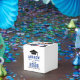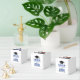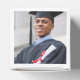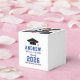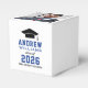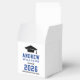Modern graduation party favour boxes feature a senior photo, grad cap, and simple and black and royal blue typography design that can be personalised with the graduate's name and school. White background and text colours can be customised to match school or party theme colours.