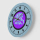 A modern design featuring shades of blue blossoms in a bright purple circle rimmed in black. A nice touch of home decor for someone who loves bold colours. Suitable for any room.