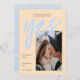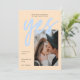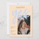 A modern Save the Date Card with a fresh colour palette of blue and blush, featuring big bold Calligraphy Script for Yes - also as a pattern on the back - and your image of choice. All colours of this Photo Save the Date Template can be changed! A unique but affordable Save the Date Invitation for modern couples.