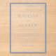Announce your wedding with modern elegance with this light blue border acrylic wedding invitation. The design features a soft blue frame set on a clear acrylic background, creating an airy and refined look within a clean, minimalist layout. Classic light blue serif lettering paired with a calligraphy script accent adds timeless balance while keeping the overall presentation polished and modern. Ideal for summer weddings, coastal celebrations, outdoor venues, and relaxed yet formal settings, this acrylic invitation offers a bright and versatile foundation that sets an inviting, elevated tone for a cohesive wedding stationery suite.