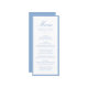 This wedding menu features soft light blue calligraphy at the top, paired with clean serif lettering for the couple’s names, wedding date, and dinner courses. The pale blue border adds a fresh, airy touch that feels perfect for spring, summer, and coastal weddings. With its crisp contrast and elegant layout, this menu card offers a bright yet polished way to display your dining details at each place setting.