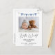 Modern single photo on the front boy's birth announcement featuring a blue bunting flag, modern calligraphy heading and black text. This modern birth announcement postcard is a sweet way to announce the birth of your newborn baby boy.