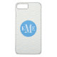 Dress up and protect your iphone with this personalised , trendy and stylish chevron zig zag striped pattern with a round circle design element that is custom monogrammed with your first, middle and last name initials. Light aqua / turquoise blue and white colours.