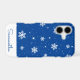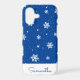 This cute Christmas iPhone 12 case features a trendy winter pattern with white stars and snowflakes on a blue background. Personalise it with a name in the matching handwriting font.