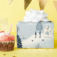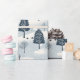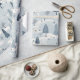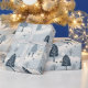 A modern, soft snowy blue and cream Christmas village pattern dotted with small, detailed houses and monochromatic blue trees.