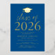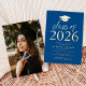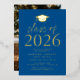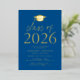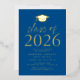 Invite guests to celebrate the grad with our modern class of 2026 graduation party invites. The invites feature a graduation cap at the top with "Class of 2026" displayed in gold foil lettering with a blue background. Personalize the invites by adding the graduate's name, school, and graduation party details. The gold foil graduation party invites reverse to display the graduate's photo.