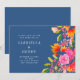 This wedding invitation features a rich blue background with vibrant painterly florals in pink, orange, and coral tones. The colourful botanical artwork paired with refined typography creates a romantic and elevated look for a garden or outdoor celebration. A beautiful choice for couples who love bold, artful wedding stationery. Available printed or as an instant digital download.