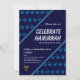 Modern midnight blue and cyan CELEBRATE HANUKKAH party invitation with DREIDEL pattern plus menorah in the corner. The reverse says HANUKKAH BLESSINGS in a tiled pattern against a cyan blue background. Customise your name and event details on the front. Matching stationery and gifts are available in the HANUKKAH Collection by Berean Designs.