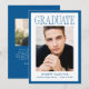 Celebrate your graduate with this Modern Blue Frame Photo Graduation Announcement, designed with a rich blue border that adds depth and refined contrast to the clean layout. The word “Graduate” appears in contemporary serif lettering across the top, while the graduate’s vertical photo takes center stage for a confident and polished presentation. Their name, school, and graduation year are arranged below in a balanced, easy-to-read format. On the reverse side, a horizontal photo is paired with space for personalized text, making it perfect for sharing graduation party details, future plans, or a heartfelt message. Suitable for both high school and college graduates, this classic blue photo graduation card offers a sophisticated and memorable way to mark this important milestone.