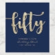 Minimalist 50th birthday blue and gold wine bottle label in modern, chic and elegant typography style. Featuring age "fifty" in sparkly gold. Customise with age, name, and year of birth.