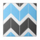 This ceramic tile features a modern herringbone pattern in blue, dark grey, and white.