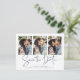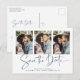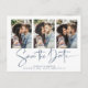 Modern Handwritten Save the Date Multiple Photo Post Card Card in classic blue and white in a font that is elegant and evokes a romantic handwritten feel. Designed to use three of your favourite photos for added customisation. Easily add your names and dates for a truly personalised design. Please contact us at cedarandstring@gmail.com if you need assistance with the design or matching products.