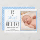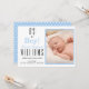 Celebrate the arrival of your precious new baby boy and share the news with family, friends, and neighbours by sending this cute and modern baby announcement card. This boy birth announcement features the text "It's a Boy!" in colours of black and soft blue. Personalise with your baby boy's photo and his birth stats.