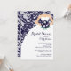 Beautiful modern bride holding a flower bouquet of blue & white flowers set on a fancy, stylish & chic blue lace background bridal shower invitation. Flip our unique bridal shower over to view a matching vintage lace back for an extra special touch. Pretty wedding shower invitation for a fall bridal shower, winter bridal shower, spring bridal shower or summer bridal shower.