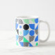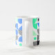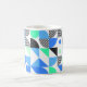 This modern mug features colourful geometric pattern with lines and shapes in black, blue and green shades on white background.