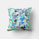 This modern pillow features colourful seamless geometric pattern with lines and shapes in black, blue and green shades on white background.