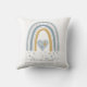 "Modern Dusty Blue Muted Rainbow Baby Boy Birth Stats Throw Pillow." Contemporary simple, hand drawn design features a muted, earthy colour palette rainbow with hearts, stars, polka dots and your baby boy's name, date, time, weight and length personalised. Dusty blue, steel blue, grey, gold and a hint of blush. Art by internationally licensed artist and designer, Audrey Jeanne Roberts, copyright