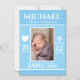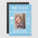 Let all your friends know your baby boy is here! This cute blue birth announcement with birth stats, and polka dots is the perfect for announcing your newborn baby. Customise it with the weight, height, date and time of birth, as well as the baby's name.