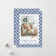 Custom blue plaid photo holiday card featuring a blue and white chequered pattern and a modern script font. Easily personalise this gingham check photo holiday card with your photo and the family name.