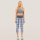 These capri leggings feature a modern plaid pattern in blue, black and white.