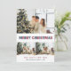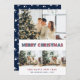 Custom blue and red photo Merry Christmas card featuring a photo collage with a modern font on the front and a dark blue background with falling snow and stars at the back. Easily personalise this red and blue photo holiday card with your photos, the family name and the year.