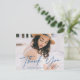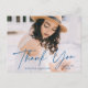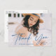 Modern photo graduation thank you postcard featuring the graduate's photo with "thank you" in a handwritten blue calligraphy script overlay. Personalise the front of the graduation thank you postcard by adding the graduate's name and graduation year. The photo thank you postcard reverses to display your return address and custom message.