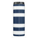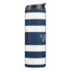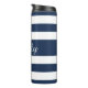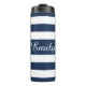 Modern Blue Stripes Script Thermal Tumbler. Thermal tumbler with a bold blue and white stripes pattern and personalised name print. Type your name in the template field to personalise it. Matching dinner and kitchen accessories available.