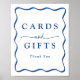 Add a stylish touch to your wedding, bridal shower, baby shower, graduation party, or other special event with this Modern Blue Wavy Frame cards and gifts sign. The design features "Cards and Gifts" in bold blue lettering surrounded by a blue wavy border contrasting with a white background. Personalise the retro cards and gifts sign with your custom text below. Choose between professional printing or instant download options, providing flexibility for your convenience.