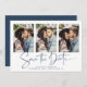 Modern Handwritten Save the Date Multiple Photo Card in classic blue and white in a font that is elegant and evokes a romantic handwritten feel. Designed to use three of your favourite photos for added customisation. Easily add your names and dates for a truly personalised design. Please contact us at cedarandstring@gmail.com if you need assistance with the design or matching products.