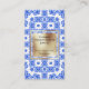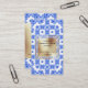 A beautiful blue and white bold floral pattern in repeating geometric squares has a faux gold inlay on which templates for your business name and title appear. The back has the same Mediterranean design and additional templates for your company particulars. These are ideal for any corporate dealing with the import / export of tiles; for potters and clay specialists and interior decorators and designers inspired by the coastal blue waters of the Turquoise coast and the Greek Islands.
