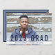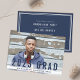 Modern blue and white graduation photo announcement or party invitation features your landscape orientated senior photo on the front, with "201X Grad" in navy blue typeface and transparent white overlay stripes displaying the graduate's name and school. Add your party details to the back in matching navy and white; or, clear the back text to use as a simple graduation announcement.