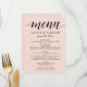 Modern and chic blush pink wedding menu cards feature a stylish black typographic design with bold calligraphy script accents and elegant custom text that can be personalised with your delicious dinner menu details and a monogram of the bride and groom names and wedding date.