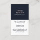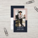 The front of the business card features a photo layout with a two-tone blush and dark navy background with the company name. The reverse side features a two-tone minimal design with dark navy on the upper half and white on the bottom featuring the contact info and business name in a clean and minimal layout. You can customise the text size, font, colours, and background colour to suit your own personal preference.