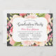 Graduation party invitation design features soft black and bright pink text that can be fully personalised for your graduate's special event, framed by a decorative gold frame and a pretty watercolor floral arrangement with green foliage and pastel pink, blush, and peach spring dahlia and rose flowers with black chalkboard style background. A pattern of white and pink horizontal stripes dresses up the back of the card.