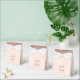 The front flap of this elegant modern wedding favour box features a rose gold faux glitter border. The customisable text combines charcoal grey handwriting and copperplate fonts over a large ampersand on a blush pink background.