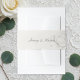 A stylish, modern wedding invitation belly band featuring a beige background adorned with a delicate rose illustration, customizable with the bride and groom’s names.
