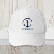 Modern nautical-themed hat featuring a a navy blue illustration of an anchor within a circle and your boat's name in simple typography.