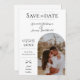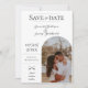 Announce your wedding day with this Modern Boho Arch Photo Save the Date Announcement in white. Save the Date design features an arch style photo placement for the happy couple with elegant and modern text design. Add a photos and wedding details to customise.