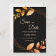 Announce your upcoming wedding in style with our Elegant Autumn Botanical Gold Frame Save the Date card. This design features a striking black background, accentuated by warm apricot-coloured fonts that create a vivid and inviting look. Delicate leaves in shades of soft muted earth tones and earthy autumnal copper shades add a cosy and romantic autumnal feel, while the geometric frame, blending burnt orange and terracotta hues, lends a rustic yet elegant touch. Perfect for autumn, fall, or winter celebrations, this save the date card captures the botanical charm and modern minimalism of a love-filled union. Ideal for couples seeking a romantic and sophisticated way to share their special day, this card radiates warmth and elegance, ensuring your guests mark their calendars for a wedding to remember.