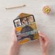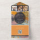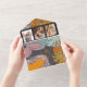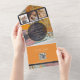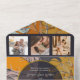 A one-of-a-kind bohemian chic all-in-one wedding invitation in vibrant orange and black, featuring abstract watercolor foliage and elegant gold accents. Personalise this striking design with four custom photos of the couple, and include your website and QR code for easy RSVP and additional details. You don't need an envelope, just add your return address on the top flap, seal it, and send with love!