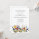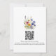 Modern boho front with colorful, watercolor blue, red, yellow and white wildflower border with a splash of gold on white background. On back, a modern QR code for family and friends to scan your wedding website details. All templates provided to make this easily ready for your special day.