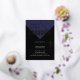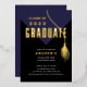 Modern & bold Class of 2022 graduation party invitation featuring a blue grad cap with a gold foil tassel set on a black background. Visit our shop to view this design in a variety of school colors.