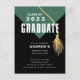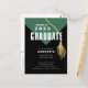 Modern & bold Class of 2022 graduation party invitation featuring a green grad cap with a gold tassel set on a black background. Visit our shop to view this design in a variety of school colors.