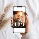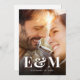 Modern wedding save the date announcement featuring your photo overlayed with your monogram initials in bold, large and elegant white typography. Personalise your save the date details on the back in simple lettering.