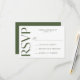 Set the tone for your upcoming nuptials with this Modern Bold Olive Green Typography wedding RSVP card. The design features "RSVP" vertically displayed in bold olive green lettering contrasting with a white background. Personalise the modern wedding RSVP card with your desired response date and custom accepts/declines lettering. This minimalist RSVP card is perfect for casual and formal weddings.