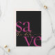 These 5" x 7" save the date cards feature a minimalist design in vibrant melon and magenta letters on a black background with placeholders on the back for the engaged couple names, wedding date, and venue information and your favourite photo!