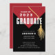 Modern & bold Class of 2022 graduation party invitation featuring a red grad cap with a gold tassel set on a black background. Visit our shop to view this design in a variety of school colors.