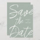 Modern wedding save the date featuring bold calligraphy script typography in sage green colour. Simply personalise with your details for custom wedding save the date cards.