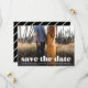 Announce your upcoming wedding with our stylish Modern Bold White Typography save the date photo cards. The modern save the date cards display your engagement photo with "save the date" in a bold white text overlay. Personalise the card by adding your names, wedding date, and wedding location. The card reverses to a customisable black and white striped background.