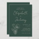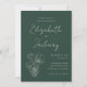 This modern wedding invitation features cream-coloured text on a dark green background. A line art floral design appears in the lower left corner. Add the names of the bride and groom in stylish cream handwriting script and the details in sans serif font.